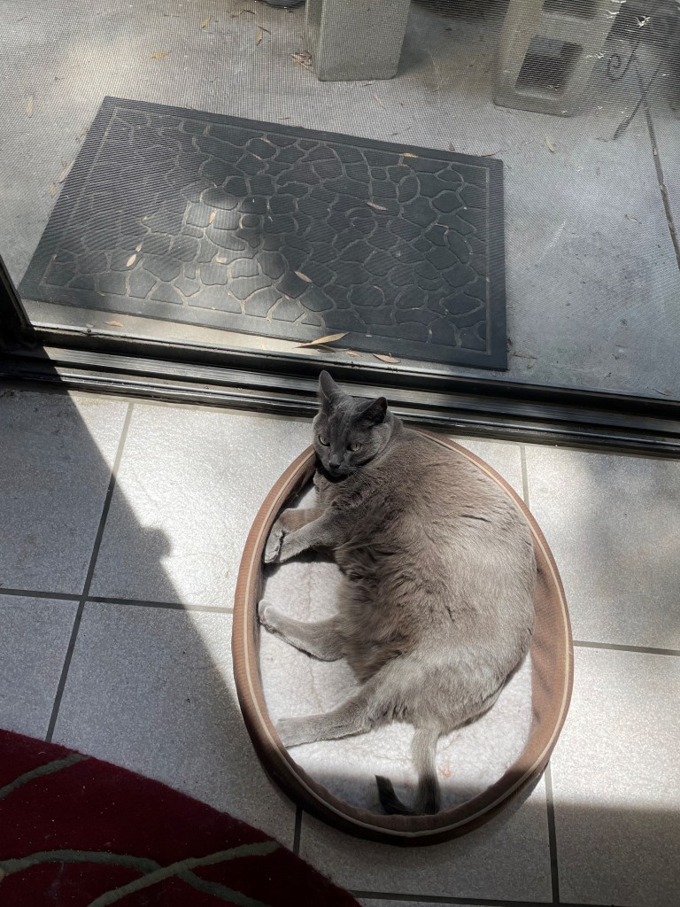 Here’s a picture of Luna lounging in her bed by the sliding glass door