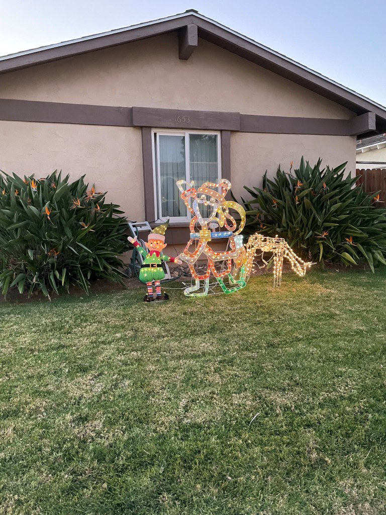 Sister’s Tree – Pretty right but not as cool as mine, you will notice several gingerbread as that is what she is into! Front yard of sister…yes I bought her that elf ha ha. The Santa waves (sometimes), they look better at night of course Looking into sister’s house, I bought her some of those garden stakes you see there including the elf and the gingerbreads.